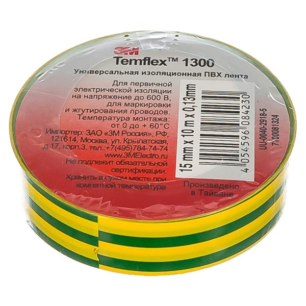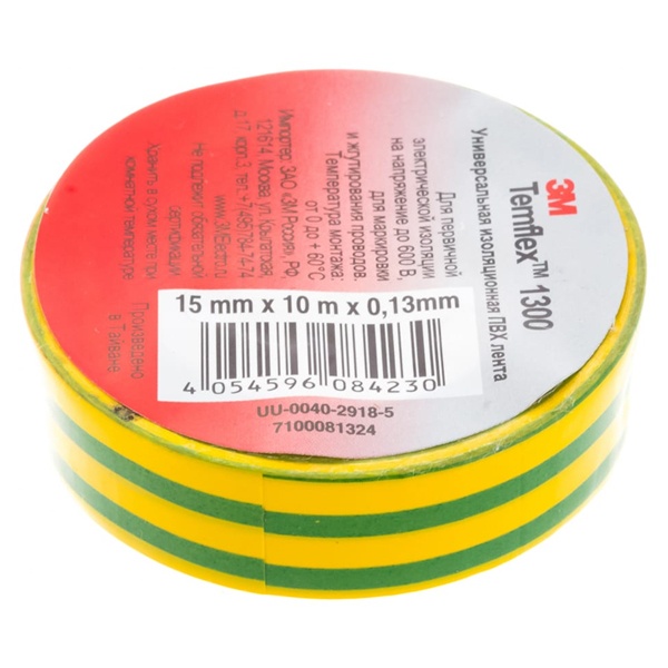 Изолента ПВХ желто-зеленая, рулон Temflex™ 1300, рулон 15мм х 10 метров, 3М 7100081324