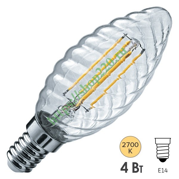 Светодиодная лампочка свеча витая Навигатор с нитевидными светодиодами, мощностью 4 Ватта, с цоколем E14, теплый свет, прозрачная колба 71311