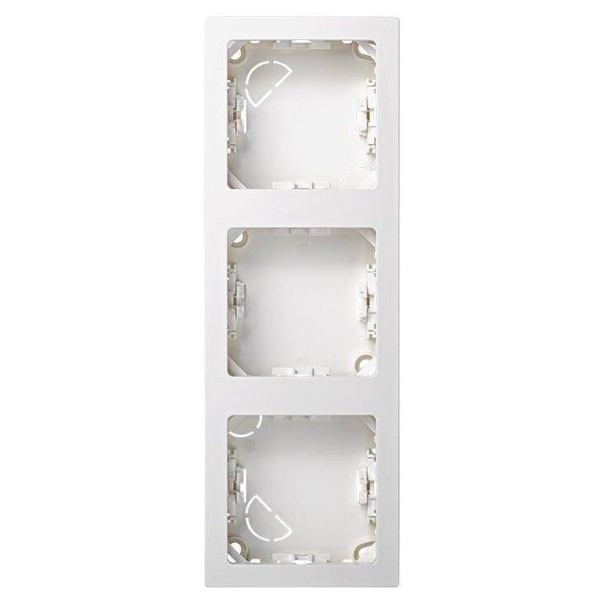 Размеры рамки (75х217 мм) и её конструкция позволяют разместить три механизма (выключатели, розетки, диммеры или другие компоненты системы) в горизонтальной компоновке. Это даёт возможность не только удобно использовать пространство для размещения электрической арматуры, но и создать гармоничный внешний вид на стене. Накладной монтаж делает процесс установки простым и удобным: достаточно закрепить рамку на поверхности стены без необходимости скрытого монтажа, что особенно актуально при ремонте или в условиях ограниченного пространства.