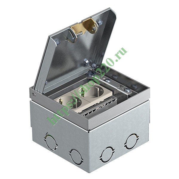 Квадратный лючок для установки в двойном полу с сухим типом уборки и в стяжке. Корпус со штампованными отверстиями для ввода труб(М25). Верхняя часть выравнивается по поверхности напольного покрытия с помощью 4-х регулируемых по высоте опор. Минимальная монтажная глубина составляет 110мм, диапазон регулирования + 20мм. В комплекте с двойной розеткой. С помощью дополнительных суппортов можно установить максимум 2 телекоммуникационных модуля (Keystones). Откидная крышка с выемкой 15мм для фрагмента напольного покрытия. Видимые поверхности из нержавеющей стали.