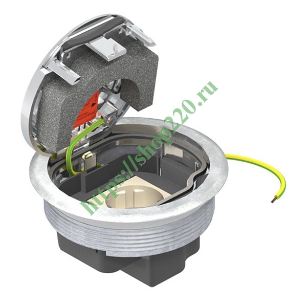 Круглый лючок с защитной рамкой для напольного покрытия; предусмотрен для установки в монтажном основании UDL2-120. В комбинации с монтажной крышкой DUG.RM2 допускается установка в монтажных основаниях номинального размера 190, 250 или 350. Лючок с одинарной розеткой 33° с защитным контактом. С боковой стороны рядом с розеткой можно дополнительно установить максимум 2 телекоммуникационных модуля. При закрытом лючке допускается влажный тип уборки. Минимальная монтажная глубина составляет 70мм. Поверхность хромированная.