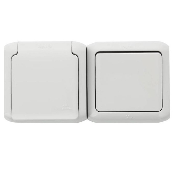 Блок ОП выключатель + розетка с заземл. защ. шторки IP44 Quteo сер. Leg 782348