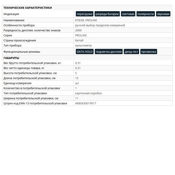 Мультиметр цифровой KT 830L "PROLINE" КВТ 79127