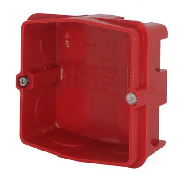 Коробка их красного пластика, квадратной форму шириной 85 мм и глубиной 50мм