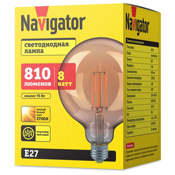 • Светодиодная ретро лампа Navigator 80 541 NLL-F-G125-8-230-2.7K-E27-GD 8W 2700K 230V шар