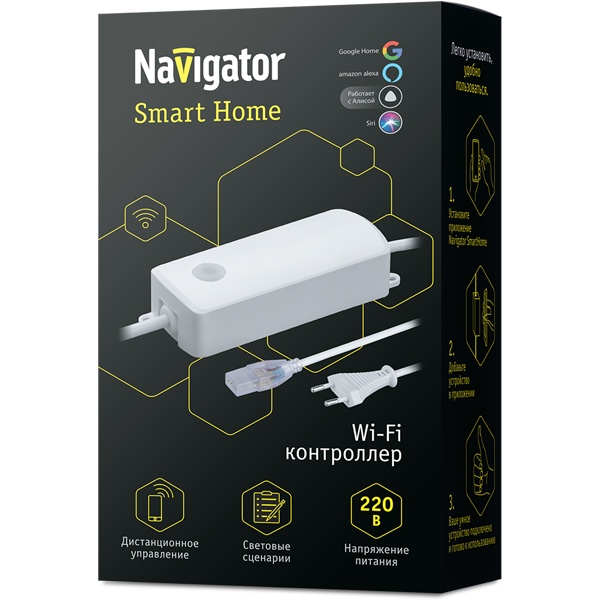 Контроллер предназначен для дистанционного управления многоцветными светодиодными лентами RGB сетевого напряжения 230 Вольт. Позволяет управлять питанием, регулировать уровень яркости и цвет светодиодной ленты, а также создавать уникальные сценарии с мобильных устройств через приложение.