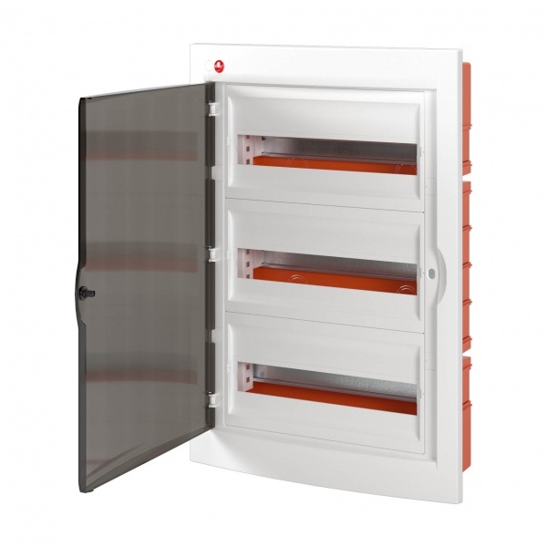 Модульные распределительные щитки, от известного отечественного производителя – электротехнической компании ДКС, серии – RAM base, используется для организации щитовой установки устройств контроля и защиты энергосистем на DIN-рейку. Производственная линейка представлена щитками для накладной и встраиваемой установки, с различной степенью защиты наполнения.Ознакомившись с каталогом нашего интернет магазина можно осуществить оптимальный выбор оборудования по основным параметрам:• тип монтажа;• уровень защиты от внешних воздействий;• полезный модульный объем.Предлагаемый здесь распределительный щиток на 54 модуля предназначен для встроенной установки в пустотные конструкции. Электрооборудование располагается в три ряда. Данный встраиваемый щиток изготовлен из термопласта и оборудован прозрачной дверцей. Полная комплектация представленного изделия предполагает наличие:• суппортного устройства для установки DIN-реек;• DIN-рейки;• корпуса;• лицевой панели с дверцей;• аксессуаров монтажа (винты, заглушки).Размещение распределительного щитка – помещения с нормальным микроклиматом.