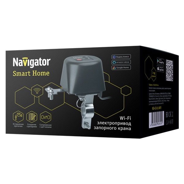 Электропривод запорного крана Navigator NSH-ED-01 предназначен для дистанционного управления шаровыми кранами в системах подачи воды или газа. Устройство позволяет управлять подачей воды или газа посредством команд из приложения Navigator Smarthome, либо в соответствии с записанным сценарием, например, автоматически перекрывать кран при обнаружении утечки соответсвующим датчиком в системе Умный дом.