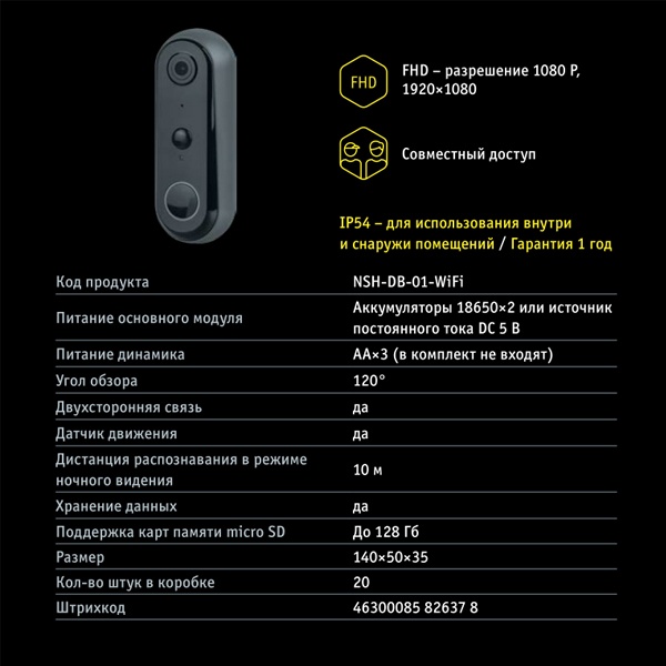 82637 Умный дверной звонок Navigator NSH-DB-01-WiFi камера угол 120гр IP54 поддержка micro SD