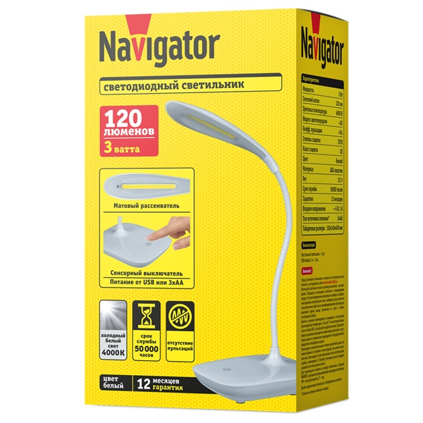 Настольный, портативный LED светильник Navigator сенсорный с функцией диммирования, нейтральный белый свет, белый, работа от USB или элементов питания 82983
