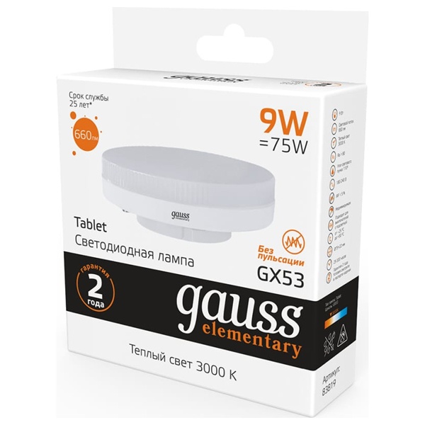 83819 Лампа светодиодная таблетка Gauss Elementary 9W 2700K 230V GX53 660Lm теплый свет