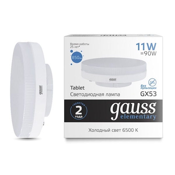 • Лампа светодиодная таблетка Gauss Elementary 11W 6500K 230V GX53 850lm дневной свет