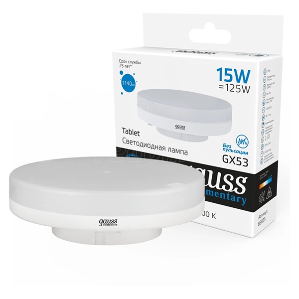 • Лампа светодиодная таблетка Gauss Elementary 15W 6500K 230V GX53 1140Lm дневной свет