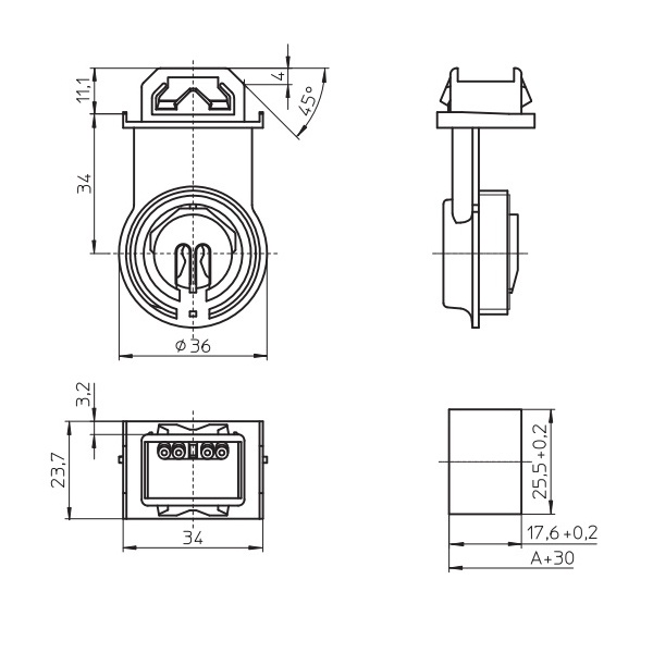 Патрон Vossloh Schwabe VS 84108 под цоколь G5 — это тот самый «рабочий» держатель для линейных люминесцентных ламп и трубчатых LED-замен, когда светильник должен жить не в тепличных условиях. Защелкивающаяся посадка и степень защиты IP65 делают его удобным решением для корпусов, где важны плотность, аккуратная сборка и нормальная ремонтопригодность.