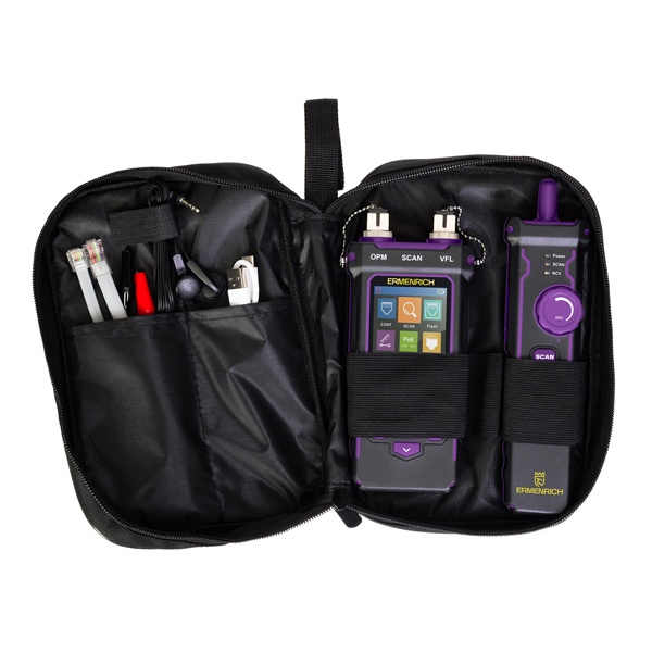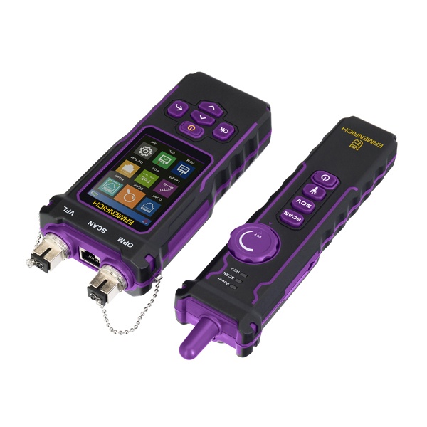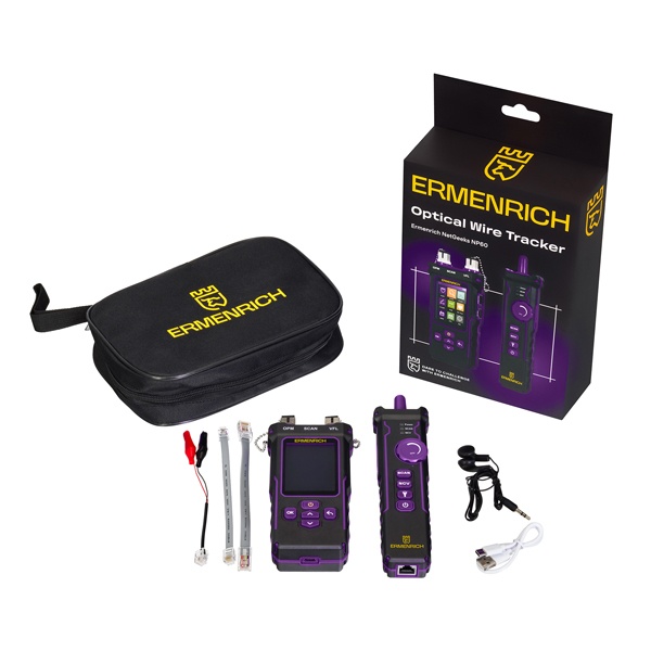 Ermenrich NetGeeks NP60 – профессиональное многофункциональное устройство «3 в 1»: это и кабельный тестер, и измеритель длины кабеля, и оптический мультиметр. Прибор предназначен в первую очередь для проверки состояния сетей на базе витых пар и оптоволокна. Он представляет собой комплект из передатчика и приемника: каждый выполняет свою роль в диагностике в зависимости от задачи. Передатчик оснащен цветным LCD-дисплеем с диагональю 2,8". Благодаря простому меню с понятными иконками и эргономичной компоновке устройств комплекта, работать с тестером не составит труда.