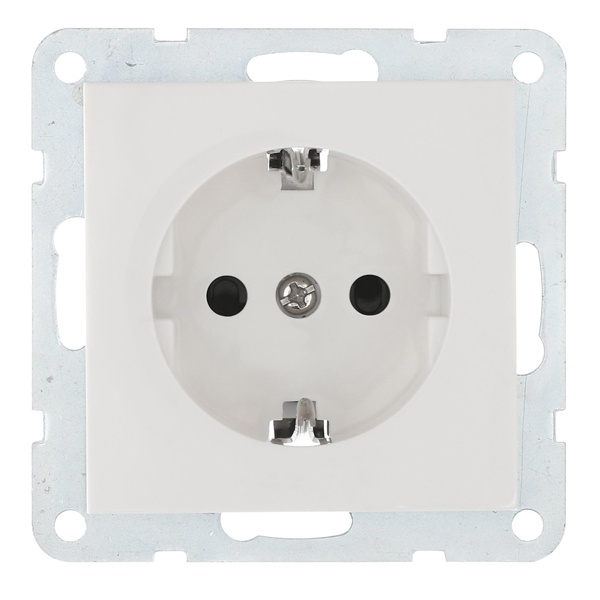 Накладка розетки выполнена в виде правильного четырехугольника белого цвета, который замечательно сочетается с любой палитрой, используемой в дизайнерских интерьерных решениях. Контактные вводы оснащены защитными шторками, препятствующими попаданию на рабочие контакты твердых пылевых частиц. Такое дополнение позволяет сохранять соединениям надлежащий уровень электрической проводимости и способствует максимальному продлению эксплуатационного срока механизма.