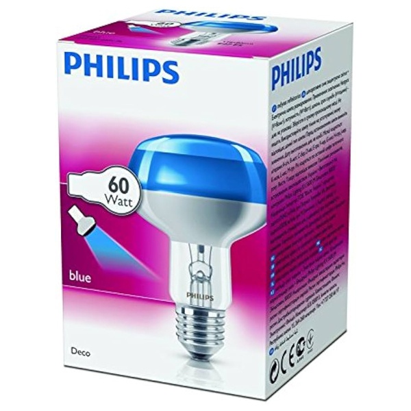 Лампа зеркальная Philips Reflector NR80 BL 60W E27 230V BLUE/Синий — декоративная зеркальная лампа с синим светом, предназначенная для создания акцентного освещения и визуальных эффектов. Форма рефлектора NR80 помогает направлять световой поток, что делает лампу удобной для подсветки отдельных зон, предметов и декоративных элементов. Подходит для установки в светильники и патроны с цоколем E27 и рассчитана на работу от сети 230 В.