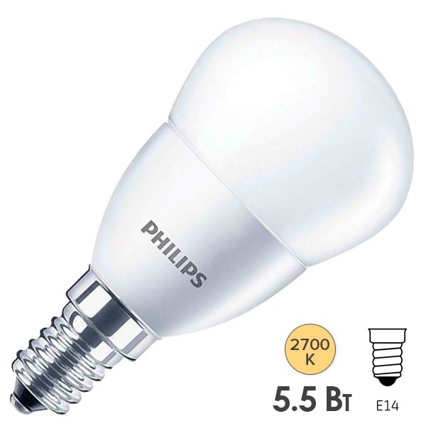Светодиодная лампочка шарик Филипс, мощностью 5,5 Ватт, с цоколем E14, теплый свет 929001960107
