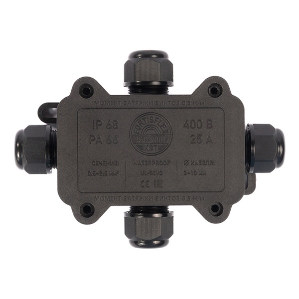 Черная влагозащищенная накладная распаячная коробка 4 гермоввода 89511