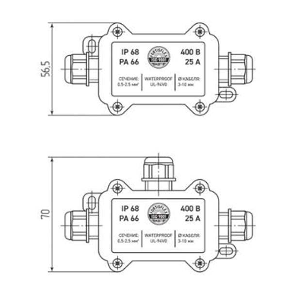 Распределительные коробки предназначены для герметичного соединения и ответвления кабельных линий, а также их защиты от влаги и воздействия окружающей среды, имеют степень защиты IP68. Корпус коробки изготовлен из пластика (нейлон 6.6) черного цвета, не содержит галогенов, не распространяет и не поддерживает горение. Уплотнитель кабельных вводов и прокладка крышки коробки выполнена из силикона. Эластичные уплотнительные кольца обеспечивают возможность монтажа кабеля различного диаметра. Предусмотрены интегрированные герметичные кабельные вводы типа MG. Крышки коробок фиксируются с помощью шурупов входящих в комплектацию.