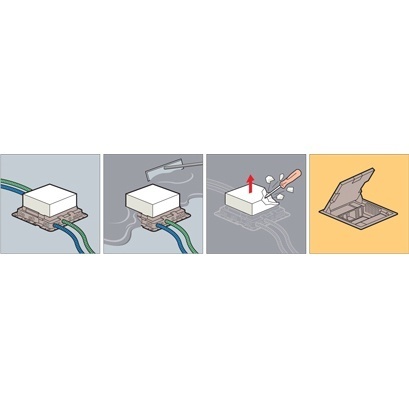 Коробка для монтажа лючков Legrand в пол под розетки MosaicМонтажную коробку следует закреплять до заливки бетона, подведя к ней заложенные в гофрированную трубу силовые и (или) информационные кабели. Затем следует заливка бетона и корректировка (срезание) части коробки, оказавшейся выше уровня бетона. В данном отверстии и следует размещать напольный лючок. В зависимости от необходимого количества розеток рекомендуется установка в углубление высотой 75 мм и более. В моделях с маркировкой 75 – 105 мм глубина коробки регулируется.