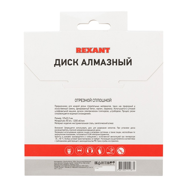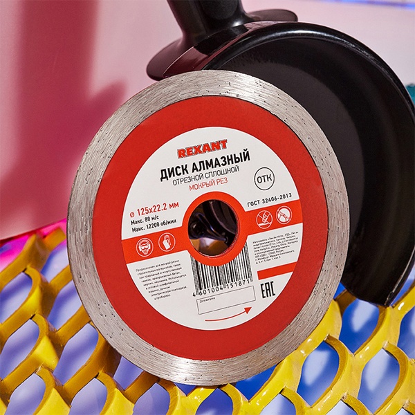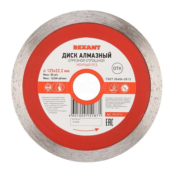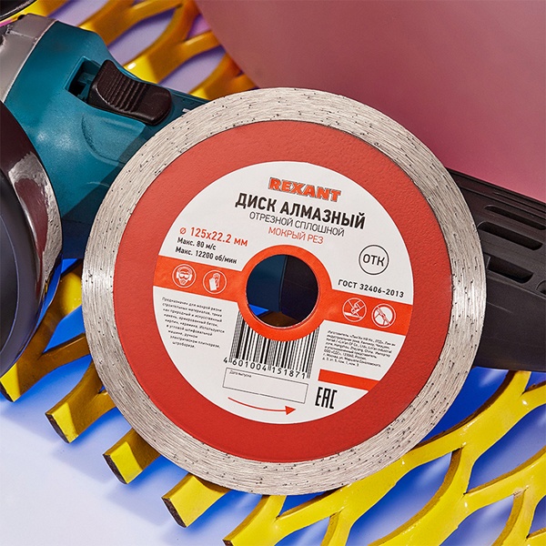 Диск алмазный отрезной сплошной 125x22.2 мм, для мокрой резки по камню, бетону, керамике Рексант 90-0111
