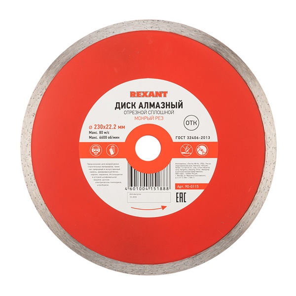 Диск алмазный отрезной сплошной 230х22.23х2.4х10мм Rexant 90-0115