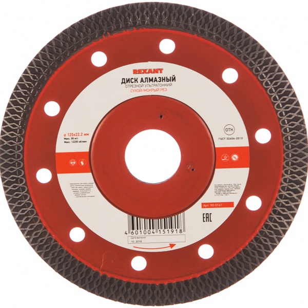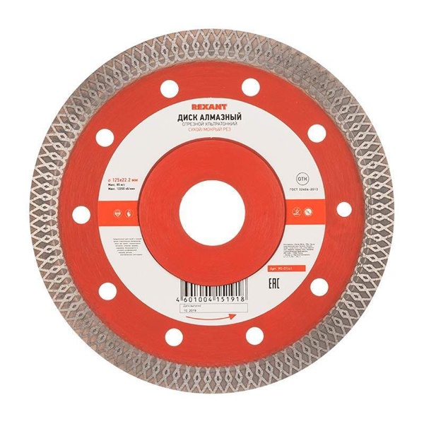 Диск алмазный отрезной ультратонкий 125x22.2 мм REXANT предназначен для сухой и мокрой резки строительных материалов, таких как гранит, керамогранит, песчаник, клинкер, мрамор, керамика. Используется в угловой шлифовальной машине, ручном электрическом плиткорезе.