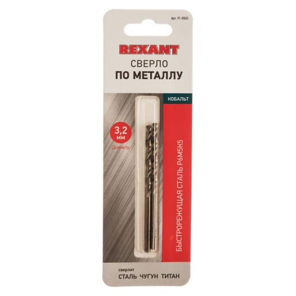 Сверло по металлу 3,2 мм «Кобальт» (сталь HSS-Co 5% M35 P6M5K5) (2 шт. в блистере) DIN 338 REXANT