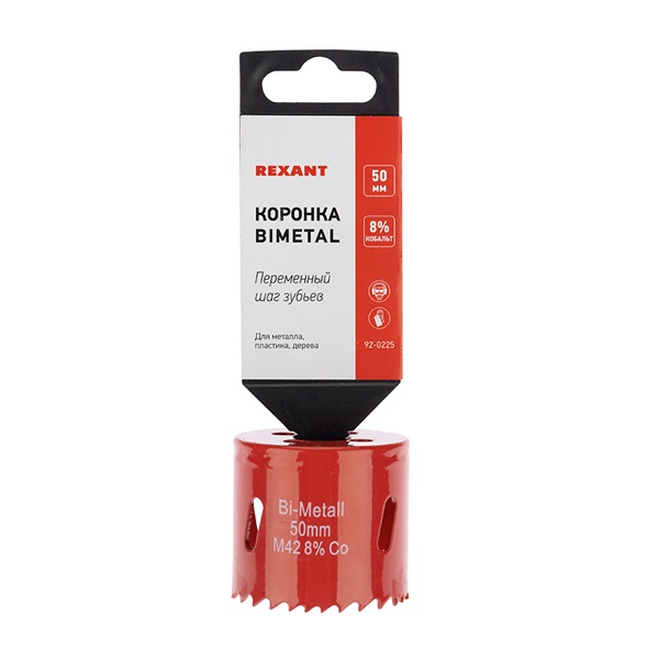 Универсальная биметаллическая коронка бренда Rexant серии Bimetal диаметром 50 мм применяется для сверления сквозных отверстий большого диаметра в листовой стали, пластике, дереве, и гипсокартоне. Легкое сверление с получением точного и чистого отверстия осуществляется благодаря специальным углам наклона и разводке зубьев. Она имеет переменный шаг зубьев 4-6 з/д. Для изготовления коронки используется высокоскоростная инструментальная сталь М42 с 8% содержанием кобальта и высоким запасом прочности, поэтому режущая кромка выдерживает большие нагрузки без деформации. Коронка может использоваться совместно со сверлильным станком, перфоратором без удара, дрелью, шуруповертом. Сверление осуществляется в безударном режиме. Максимальная глубина сверления составляет 50 мм. Для долгой службы инструмента сверление необходимо осуществлять с применением смазочно-охлаждающей жидкости.