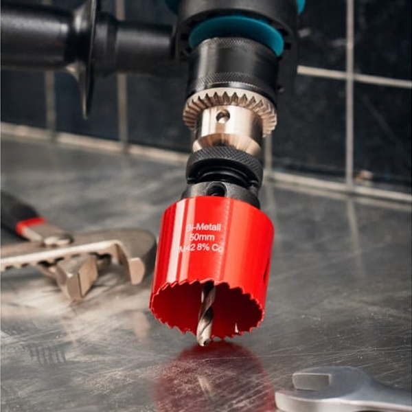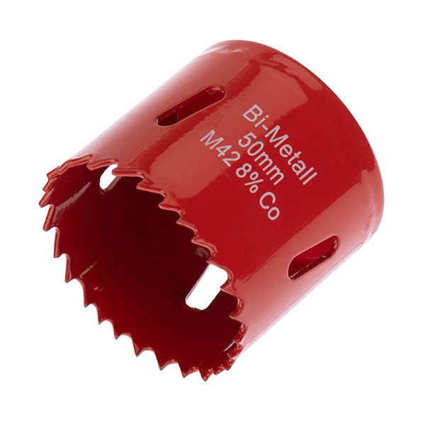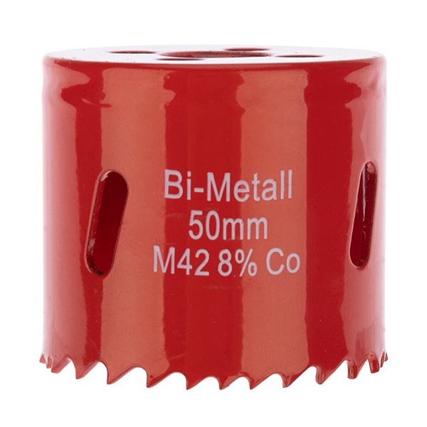 Биметаллическая конструкция коронки сочетает в себе прочность и износостойкость режущей кромки с упругостью основы, что обеспечивает длительный срок службы и устойчивость к перегреву и вибрациям. Диаметр 50 мм является распространенным размером для установки различных электротехнических и сантехнических изделий.