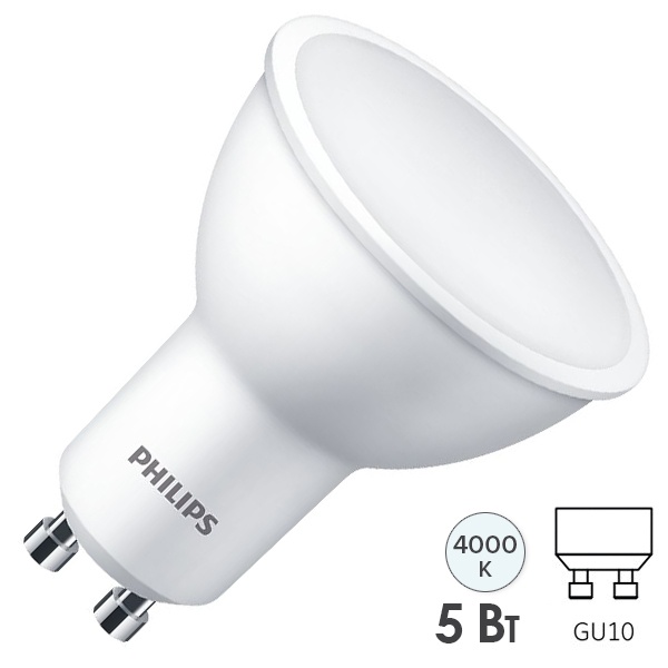 Лампа светодиодная Philips Essential LED 5W/840 (50W) 230V GU10 120° 500Lm — экономичное и надежное решение для точечного освещения в светильниках с цоколем GU10. Лампа предназначена для работы от сети 230V и обеспечивает яркий нейтрально-белый свет 4000K (код 840), подходящий для повседневных задач: освещения рабочих зон, коридоров, витрин и акцентной подсветки. Благодаря световому потоку 500 лм и широкому углу рассеивания 120° свет распределяется равномерно, без резких переходов, что удобно для общего освещения помещений.
