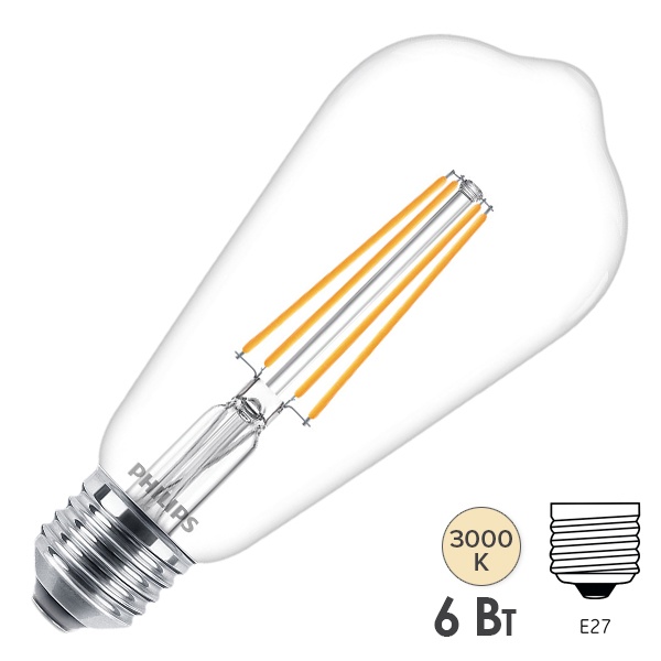 Филаментная лампочка Филипс с нитевидными светодиодами, мощностью 6 Ватт, с цоколем E27, теплый свет, прозрачная колба 929001975013
