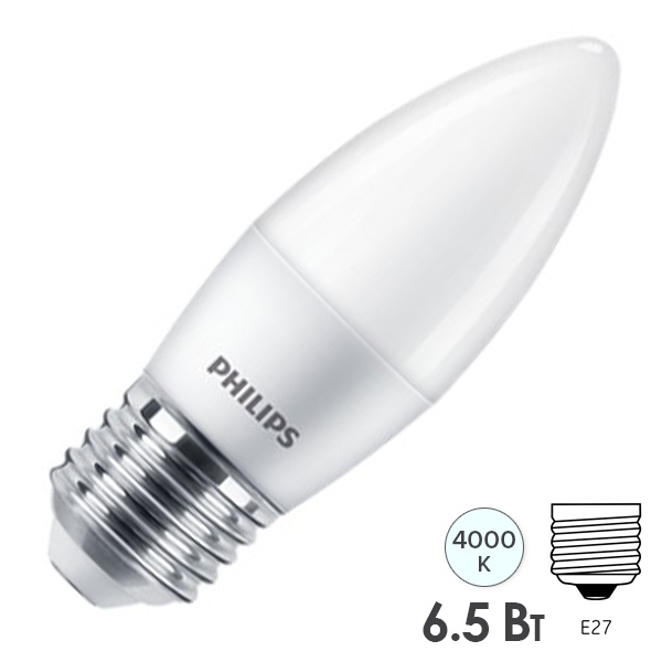 • Светодиодная лампа свеча Philips ESS LEDCandle B38 6.5W (75W) 840 230V E27 FR 650lm