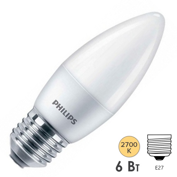 Лампа светодиодная свеча ESS LEDCandle B35 6W (75W) 827 2700K 220V E27 FR теплый свет Philips 929002970607