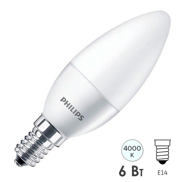 Светодиодная лампочка формы свеча Филипс мощностью 6 Ватт, с цоколем E14, нейтрального белого света 929002971107