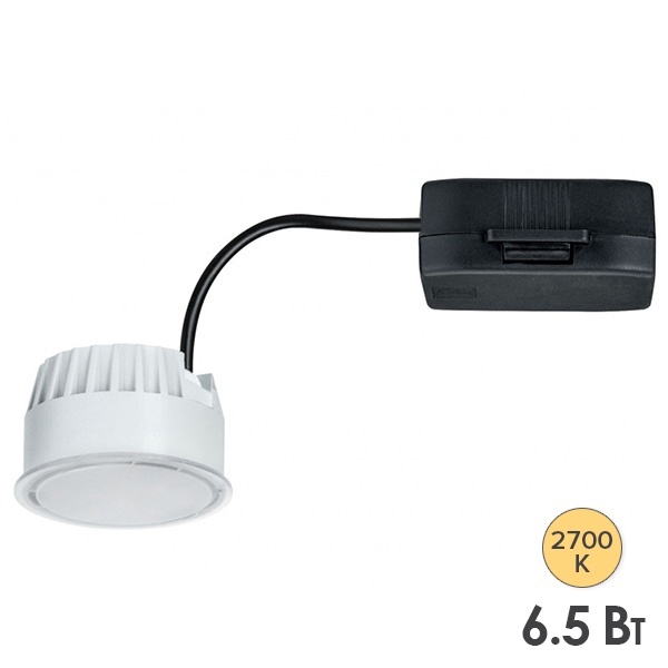 Данная модель светильника из коллекции Coin Nova от известной немецкой компании Paulmann представляет собой светодиодный модуль встраиваемого типа. Это компактное устройство, используемое для подсветки домашних и коммерческих интерьеров в современном стиле. Особенностью этого светодиодного модуля является отсутствие вредных веществ и высокая энергоэффективность. LED-модуль рассчитан на работу сети напряжением 230 Вольт и максимальной потребляемой мощностью 6.5 Ватт. Световой поток составляет 460 Люмен, а цветовая температура – 2700 Кельвин. Круглый светильник сделан из пластика и состоит из белой лампы и черной коробки управления, которая скрывается за потолочной поверхностью. Светодиодная лампа имеет высоту 3 см и рассеиватель опалового цвета с диаметром 5.1 см. Угол рассеивания составляет 110 градусов. Масса изделия составляет 99 г. Такое средство освещения обладает высокой степенью износостойкости до 50000 циклов включений и продолжительным сроком службы до 30000 ч. Главными достоинствами применения такой лампы является экономичное потребление электроэнергии, безопасность и простота в управлении.