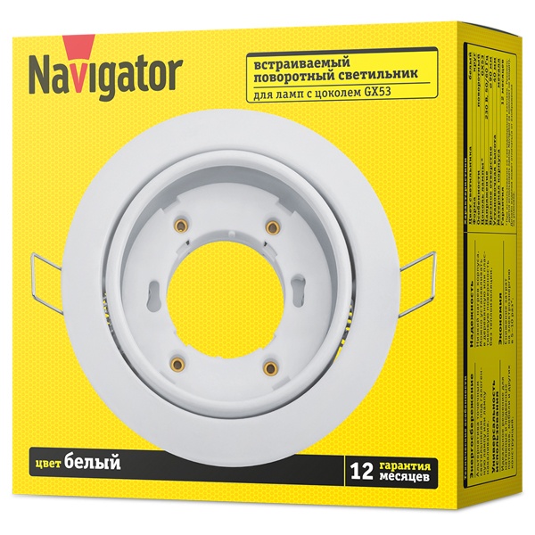 Встраиваемые декоративные поворотные светильники Navigator серии NGX для ламп с цоколем GX53 – энергосберегающая альтернатива светильникам под галогенную или лампу накаливания. Предназначены для освещения жилых и общественных помещений: гостиниц, магазинов, банков, лестниц, лифтов и т.п. Идеально подходят для подвесных и натяжных потолков, мебели и других конструкций.