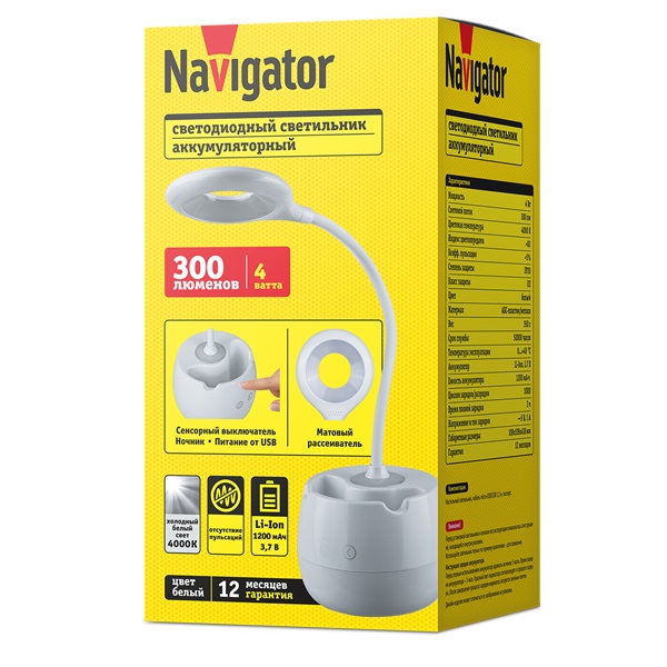 Аккумуляторные светодиодные настольные светильники Navigator серии NDF-D с интегрированным светодиодным модулем — идеальное энергоэффективное решение для локального освещения рабочего места. Настольные светильники Navigator прекрасно впишутся как в строгий офисный интерьер, так и в уютную домашнюю обстановку.