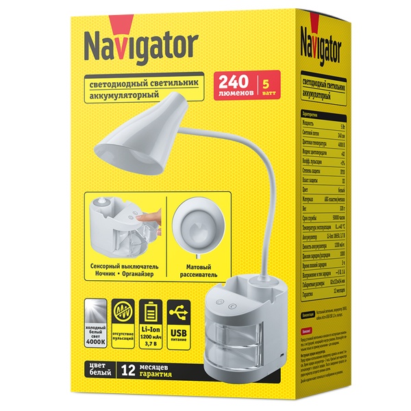 Настольный аккумуляторный LED светильник Navigator, сенсорный с функцией диммирования, нейтральный белый свет, гибкая регулируемая ножка, органайзер для канцелярских принадлежностей, белый цвет 93159