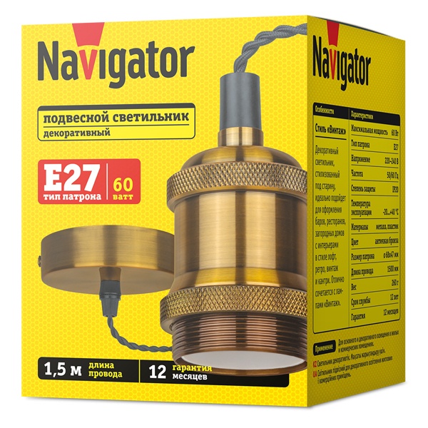 Декоративный подвесной светильник «Винтаж» Navigator, под лампу максимальной мощности 60 Ватт с цоколем E27, античная бронза 93160