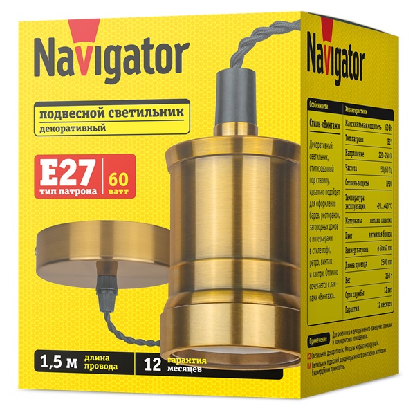 Декоративный подвесной светильник «Винтаж» Navigator, под лампу максимальной мощности 60 Ватт с цоколем E27, античная бронза 93161