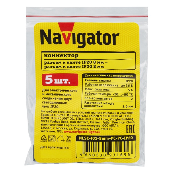 Прямой соединитель двух LED лент IP20 8 мм, Навигатор, 5 штук. 93169
