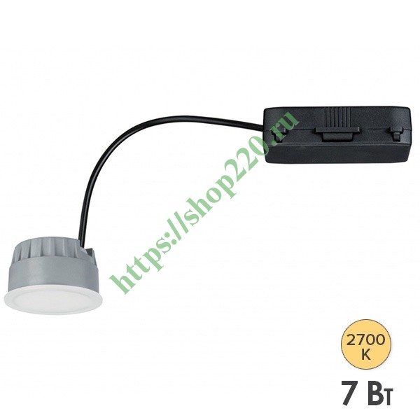 Модель потолочного LED-модуля от известного бренда Paulmann серии Coin представляет собой круглый сатиновый светильник компактного размера с плоским основанием, который имеет встраиваемый тип установки. С его помощью обеспечивается стильное и современное оформление интерьера с приятным свечением и экономичным расходом электроэнергии. Потребляемая мощность светильника 7 Ватт в сети напряжением 230 Вольт. Световой поток составляет 380 Люмен, а цветовая температура – 2700 Кельвин с углом рассеивания 105 градусов. Модуль излучает теплый белый свет. Подключение производится с помощью зажимов без применения инструмента. Главной особенностью этой модели является возможность диммирования. Управление яркостью осуществляется диммером типа RL для обычного трансформатора, например Merten MEG5133-0000.