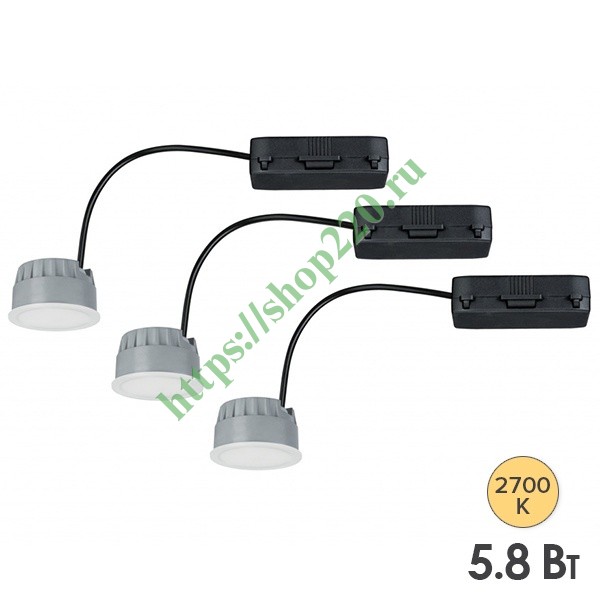 Данный вариант освещения из коллекции Coin от известной немецкой компании Paulmann представляет собой комплект светодиодных модулей, состоящий из 3 светильников. Внешне это одинаковые плоские устройства встраиваемого типа. Они обладают компактным размером и сочетают в себе инновационные технологии, используемые для подсветки домашних интерьеров в современном стиле, а также коммерческих помещений при оформлении вывесок и логотипов. Особенностью набора светодиодных светильников является экологичный состав и высокая энергоэффективность. LED-модули рассчитаны на работу от сети напряжением 230 Вольт и потребляемой мощностью 5.8 Ватт на каждый модуль. Световой поток составляет 380 Люмен, а цветовая температура – 2700 Кельвин. Круглые светильники сделаны из пластика и состоят из корпуса и соединительной коробки, которая скрывается за потолочной поверхностью. Светодиодная лампа имеет высоту 3.5 см и диаметр 4.95 см. Угол рассеивания составляет 105 градусов. Масса комплекта равна 297 г. Лампы обладают высокой степенью износостойкости до 15000 циклов включений и продолжительным сроком службы до 30000 ч работы. Главными достоинствами набора является экономичное потребление электроэнергии, безопасность и простота в подключении с помощью быстрых зажимов без применения инструментов. Интенсивность освещения можно регулировать посредством диммера типа RL для обычного трансформатора, например Merten MEG5133-0000.