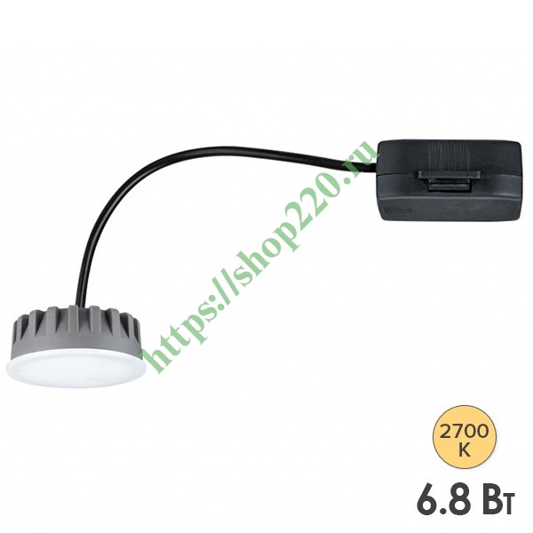 Данная модель светильника из коллекции Coin UltraSlim от известной немецкой компании-производителя Paulmann представляет собой плоский светодиодный модуль встраиваемого типа. Это компактное устройство сочетает в себе инновационные технологии и используется для подсветки домашних интерьеров в современном стиле, а также коммерческих помещений при оформлении вывесок и логотипов. Особенностью этого светодиодного модуля является экологичный состав и высокая энергоэффективность. LED-модуль рассчитан на работу в сети напряжением 230 Вольт и потребляет 6.8 Ватта. Световой поток составляет 415 Люмен, а цветовая температура – 2700 Кельвин, теплое белое свечение. Круглый светильник сделан из пластика и состоит из самого модуля с сатиновым стеклом и черной соединительной коробки, которая скрывается за потолочной поверхностью. Светодиодный блок имеет высоту 3 см и диаметр 5 см. Угол рассеивания составляет 120 градусов. Масса изделия равна 100 г. Такое средство освещения обладает высокой степенью износостойкости до 15000 циклов включений и продолжительным сроком службы до 30000 ч. Главными достоинствами применения такой лампы является экономичное потребление электроэнергии, безопасность и простота подключения.