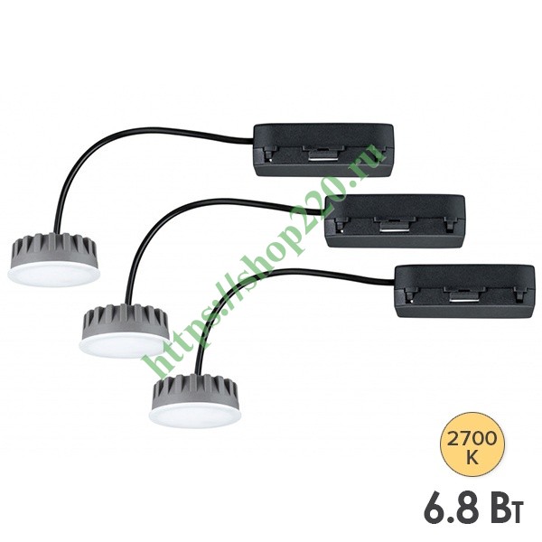 Данный вариант освещения из коллекции Coin UltraSlim от известного немецкого производителя Paulmann представляет собой комплект светодиодных модулей, состоящий из 3 светильников. Внешне это одинаковые плоские устройства встраиваемого типа. Они обладают компактным размером и сочетают в себе инновационные технологии, используемые для подсветки домашних интерьеров в современном стиле, а также коммерческих помещений при оформлении вывесок и логотипов. Особенностью набора светодиодных светильников является экологичный состав и высокая энергоэффективность. LED-модули рассчитаны на работу от сети напряжением 230 Вольт и потребляют 6.8 Ватт на каждый модуль. Световой поток составляет 425 Люмен, а цветовая температура – 2700 Кельвин. Круглые светильники сделаны из пластика и состоят из сатиновой лампы и черного соединительного блока, который скрывается за потолочной поверхностью. Светодиодная лампа имеет высоту 3 см и диаметр 5 см. Угол рассеивания составляет 120 градусов. Масса комплекта равна 317 г. Лампы обладают высокой степенью износостойкости до 15000 циклов включений и продолжительным сроком службы до 30000 ч работы. Главными достоинствами набора является экономичное потребление электроэнергии, безопасность и простота в подключении с помощью быстрых зажимов без применения инструментов. Интенсивностью свечения модулей можно управлять посредством диммера типа R+C для электронного трансформатора, например Busch-Jаеger 6513U-102, Gira 030700/I02, Jung 225 T DE.