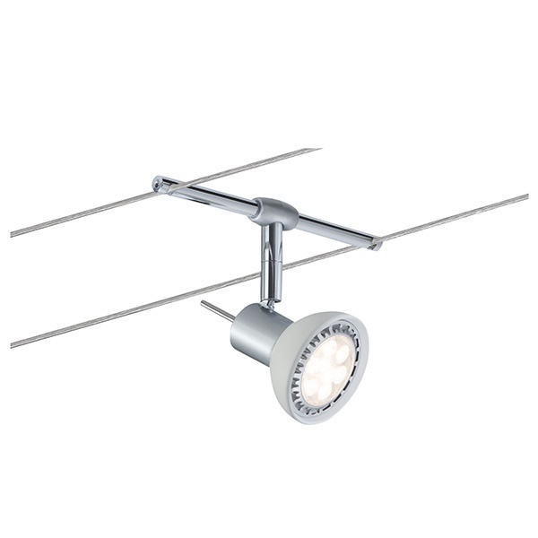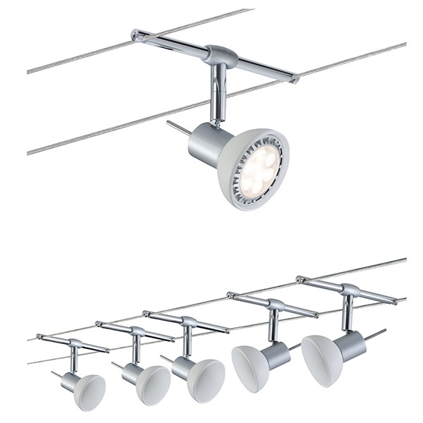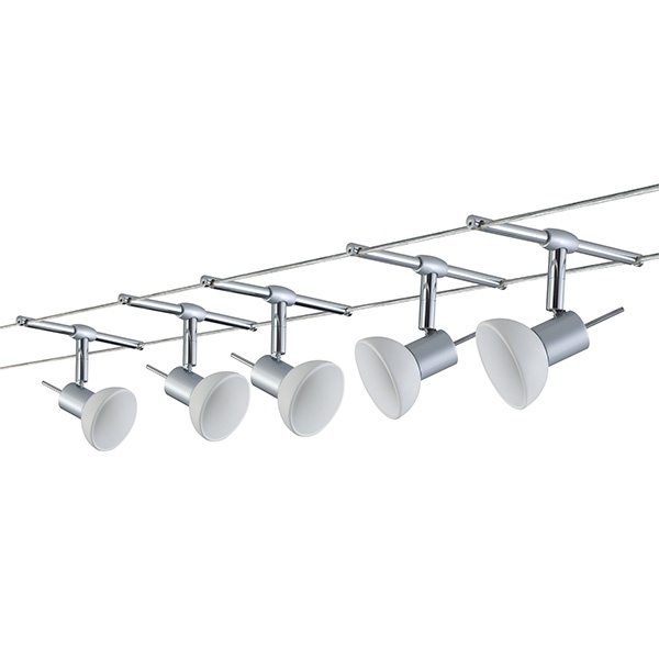 Струнная система направленного света Sheela Paulmann из пяти светильников, под лампы с цоколем GU5,3 максимальной мощностью 10 Ватт, длина троса 10 метров 94136