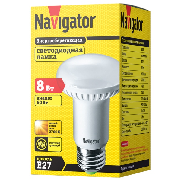 Лампа светодиодная Navigator 94 260 NLL-R63-8-230-2.7K-E27 8W 2700K 230V 600Lm теплый свет 94260