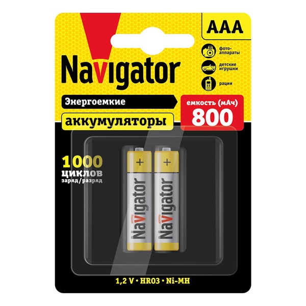 Никель-металлогидридный аккумулятор ААА Navigator емкостью 800 мА.Ч, упаковка 2 штуки 94461